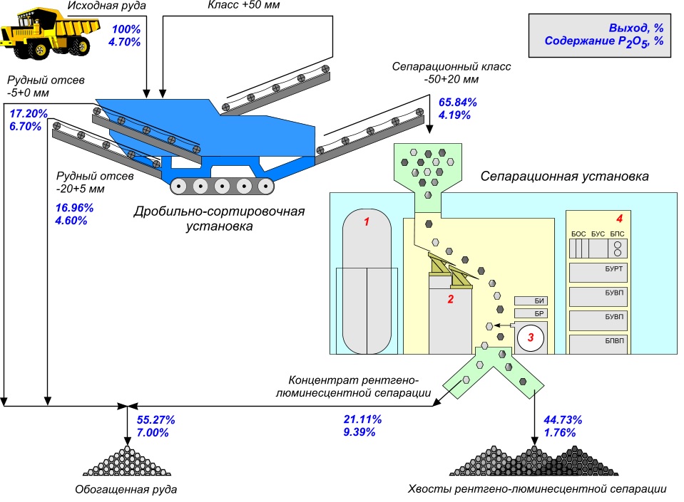 Повышение эффективности реализации процесса рентгенолюминесцентного разделения достигается за счет совершенствования системы транспортирования сепаратора. Обоснование эффективности предложенных элементов конструкции сепаратора базируется на результатах оценки комплекса методов численного в программном комплексе Rocky DEM и физического моделирования. Применение транспортирующего вибропитателя с треугольным сечением профилированной части лотка наклоненной на 14 градусов и успокоителем (наклонной под углом 24 градуса, не вибрирующей плоскости, повторяющей профиль транспортирующего лотка и составляющей 10% от него), позволило за счет выпрямления траектории движения кусков рудной массы по лотку увеличить их среднюю скорость и сократить в 1,3 раза разброс траектории в свободном падении. Перемещение кусков рудной массы через зону облучения и регистрации в ячейке барабанного раскладчика, оснащенной подвижным дном, выполненным в виде откидывающейся пластины с двумя фиксированными положениями: закрытом - в зоне облучения и открытом - в зоне выделения полезных кусков в концентрат обеспечивает 100% извлечение кусков, люминесценция, которых зарегистрирована как соответствующая регламентируемому уровню содержания полезного компонента.