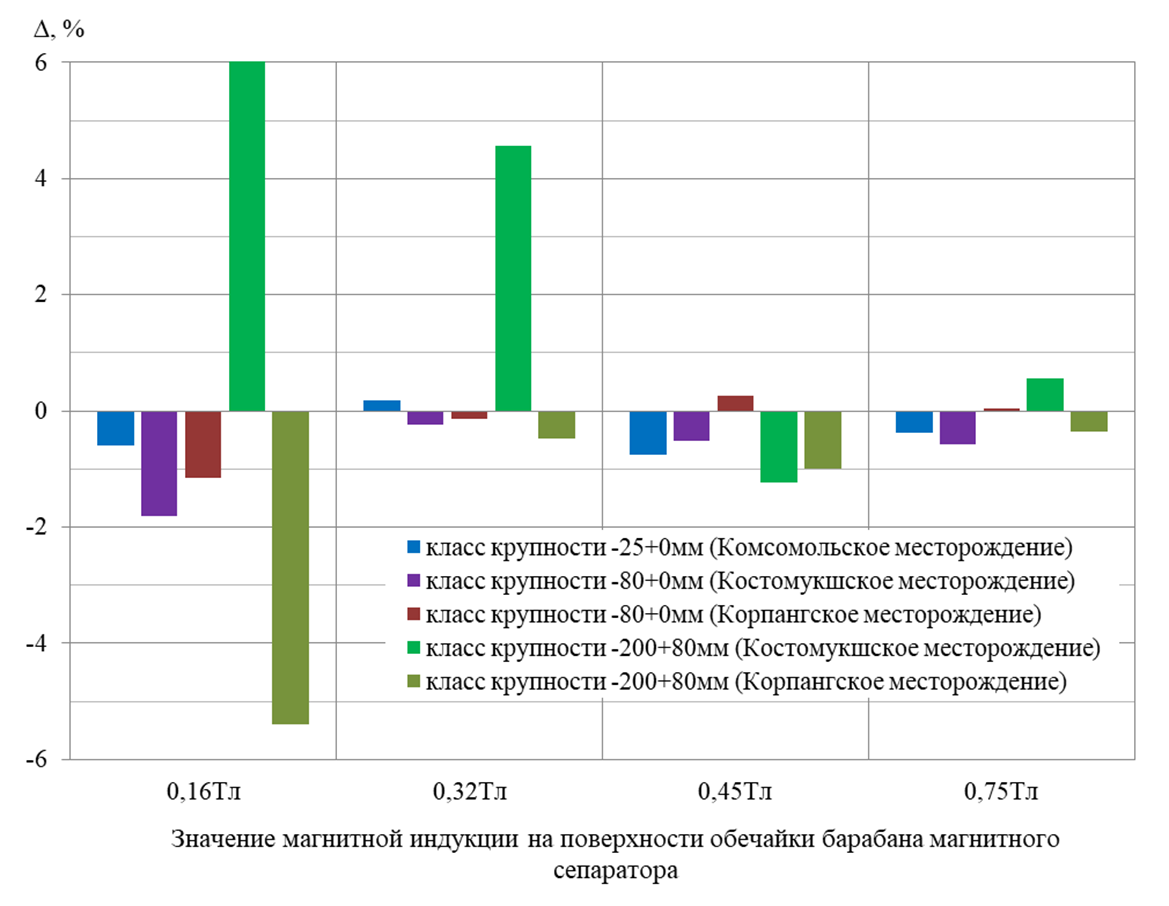 По результатам укрупненно-лабораторных исследований обогатимости железистых кварцитов установлена эффективность реализации сухой магнитной сепарации посредством барабанного магнитного сепаратора, и порционной подачи рудной массы в зону разделения вибропитателем без предварительной ее подготовки, направленной на формирование узких классов крупности, границы диапазонов которых определяются значением модуля крупности не превышающим 2,5. Качественная оценка эффективности основана на результатах анализа данных видеофиксации физического моделирования, реализованного на лабораторном барабанном магнитном сепараторе серии СМБС-Л, и имитационного моделирования на его виртуальном прототипе в программном комплексе Rocky DEM. Доказано, что использование вибропитателя в качестве узла подачи материала в рабочую зону магнитного сепаратора позволяет: формировать монослой на поверхности лотка вибропитателя толщиной, близкой к максимальной крупности куска сепарируемой руды; реализовать порционную подачу материала в зону разделения; увеличить расстояние между кусками в зоне разделения при прохождении через область свободного падения, обеспечивая за счет этого возможность проведения сухой магнитной сепарации железистых кварцитов класса крупности –80+0 мм без предварительной подготовки. Количественная оценка эффективности базируется на вычислении разности значений извлечения Feобщ в немагнитную фракцию при сепарации материала рудной массы исходной крупности и классифицированного. Показано преобладание случаев с отрицательными значениями разности извлечений, свидетельствующими о снижении потерь Feобщ с немагнитной фракцией при сепарации рудной массы исходной крупности вне зависимости от значений магнитной индукции на поверхности обечайки барабана магнитного сепаратора.
